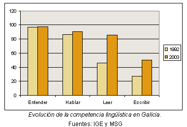 La evolución más positiva para el gallego en los últimos años se ha dado en el terreno de las competencias lingüísticas, es decir, en la capacidad que tienen los gallegos para entender, hablar, leer y escribir en gallego. Prácticamente todo el mundo entiende el gallego y 1 de cada 9 gallegos sabe hablarlo. Gracias a la escolarización en gallego y a otros factores en los últimos años se ha doblado el número de personas que sabe leer y escribir en nuestra lengua.