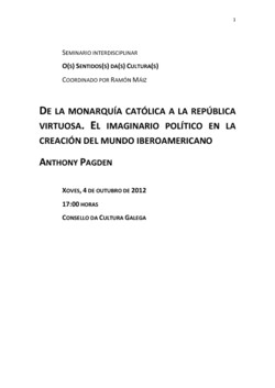 A vindeira sesión terá lugar o xoves, 4 de outubro de 2012 ás 17:00 horas, na Biblioteca do Consello da Cultura Galega coa presenza de Anthony Padgen, quen presentará un relatorio titulado: De la monarquía católica a la república virtuosa. El imaginario político en la creación del mundo iberoamericano.