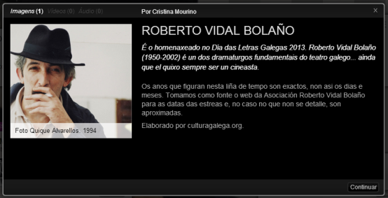 Cronograma que detalla graficamente a vida e obra de Roberto Vidal Bolaño a través das súas estreas teatrais e da súa actividade cinematográfica.
