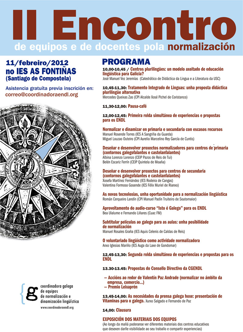 A Coordinadora Galega de ENDL convida aos coordinadores/as e membros de Equipos de Dinamización da Lingua Galega e demais docentes interesados na normalización lingüÃstica no ensino a participar no II Encontro de equipos e de docentes pola normalización, que terá lugar o sábado 11 de febreiro no  IES As Fontiñas de Santiago de Compostela. Â